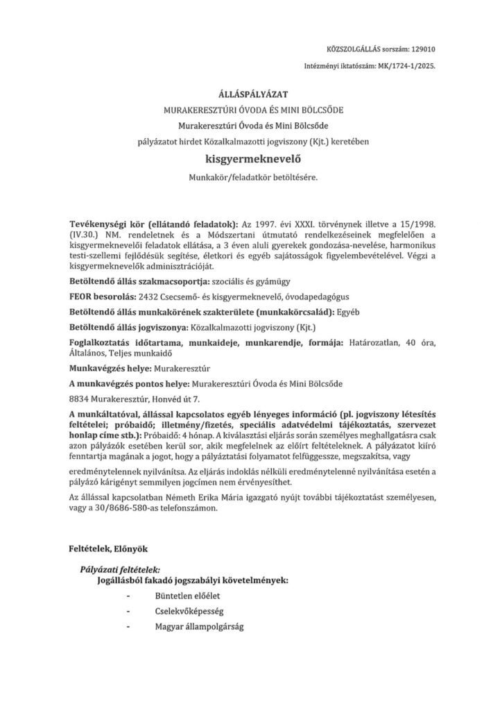 Álláspályázat kisgyermeknevelő munkakör betöltésére