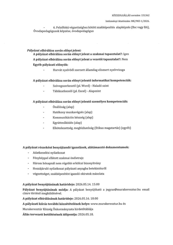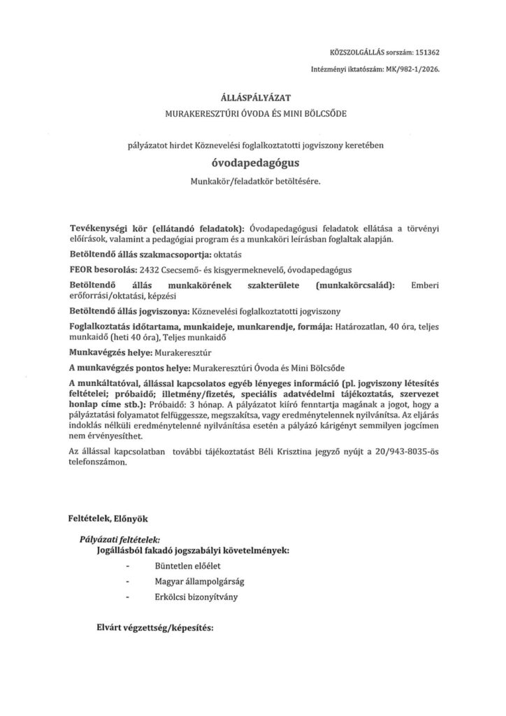 Álláspályázat óvodapedagógus munkakör betöltésére