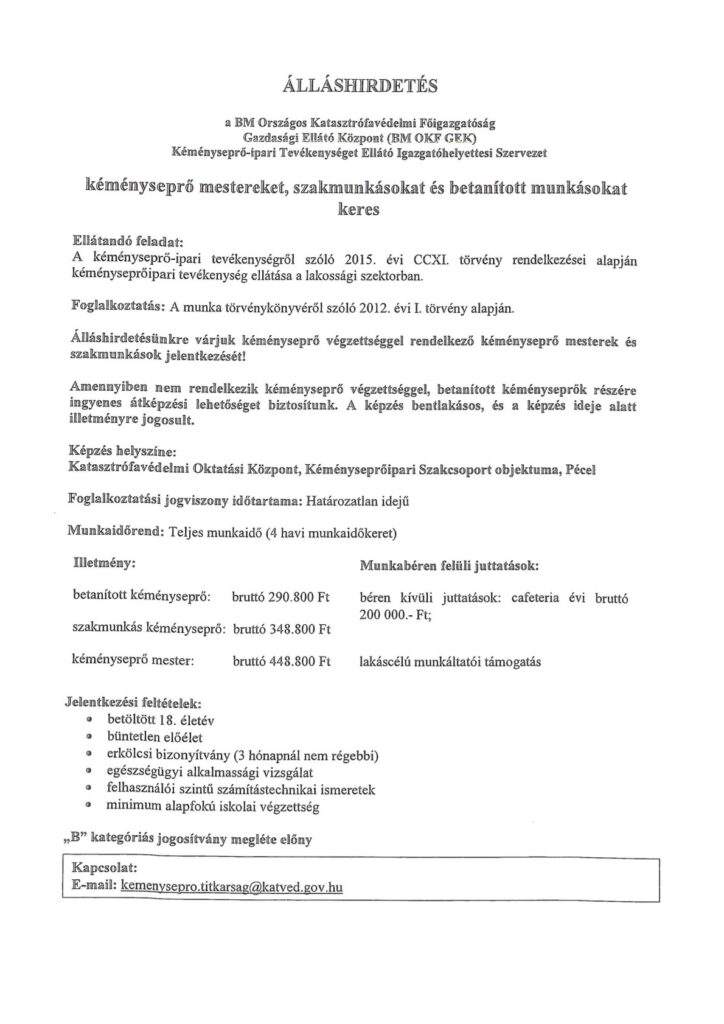 BM Országos Katasztrófavédelmi Főigazgatóság álláshirdetése kéményseprő munkakörben