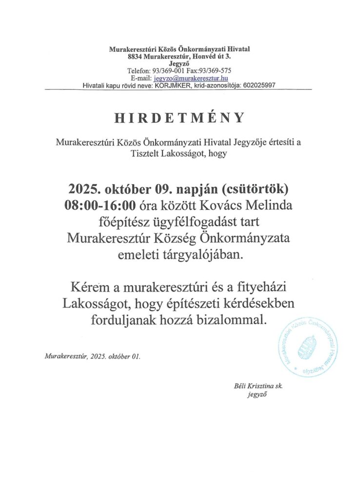 Hirdetmény főépítész ügyfélfogadásáról