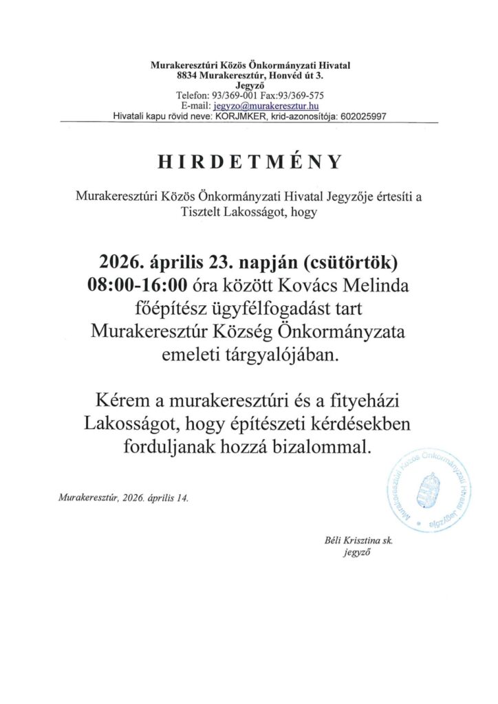 Hirdetmény főépítész ügyfélfogadásáról