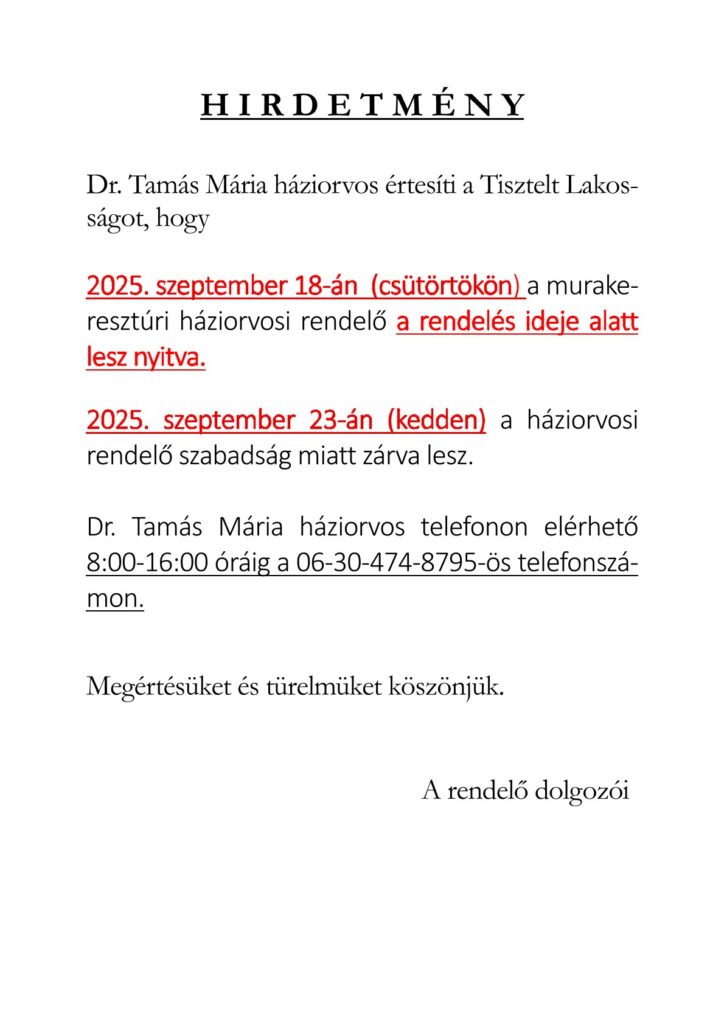 Hirdetmény háziorvosi szabadságról