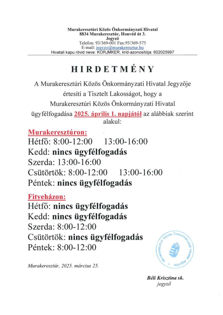 Hirdetmény hivatal ügyfélfogadási rendjének változásáról