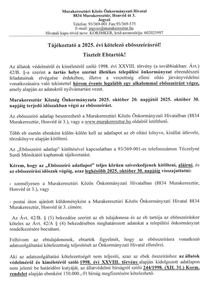 Tájékoztató a 2025. évi kötelező ebösszeírásról